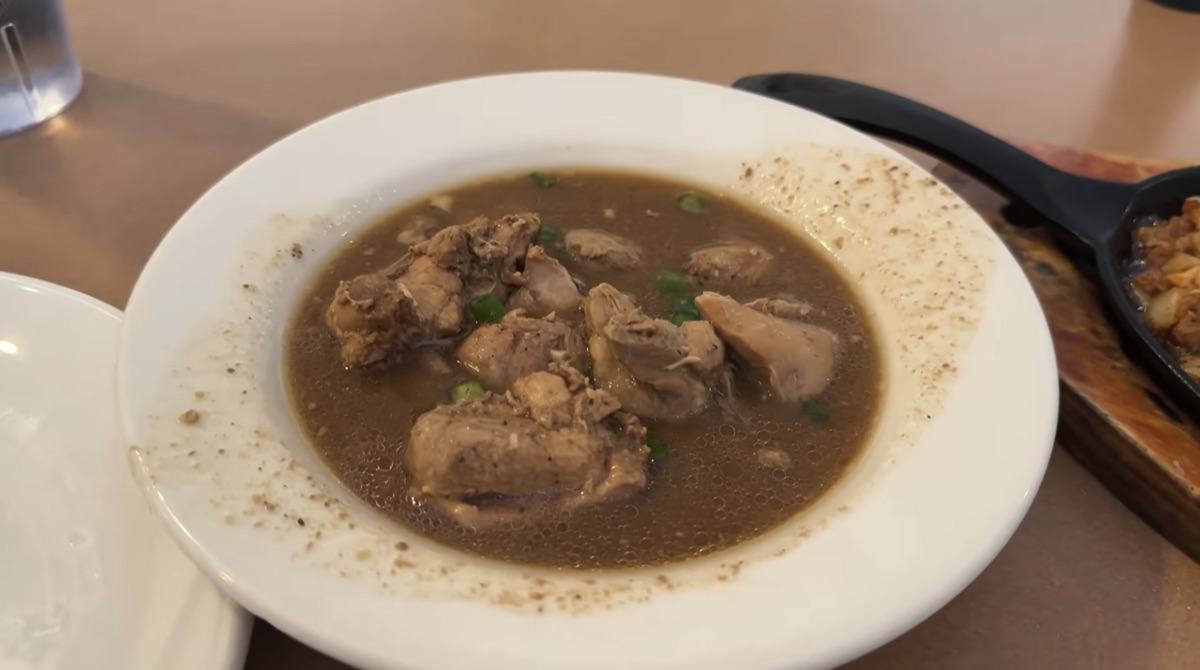 We debated pork versus chicken and went with the chicken. The broth is rich, zesty, and vinegary in a way that is deeply comforting. We ended up mixing leftover white rice directly into the Adobo soup base and eating it alongside bites of Sisig. That combination was the best thing I ate all night.