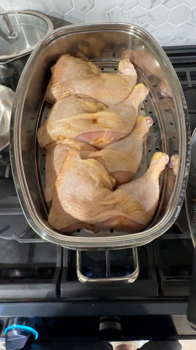 Important: Let the water come to a full boil and let the steam build up before you put the chicken in. You want maximum steam from the very first second.