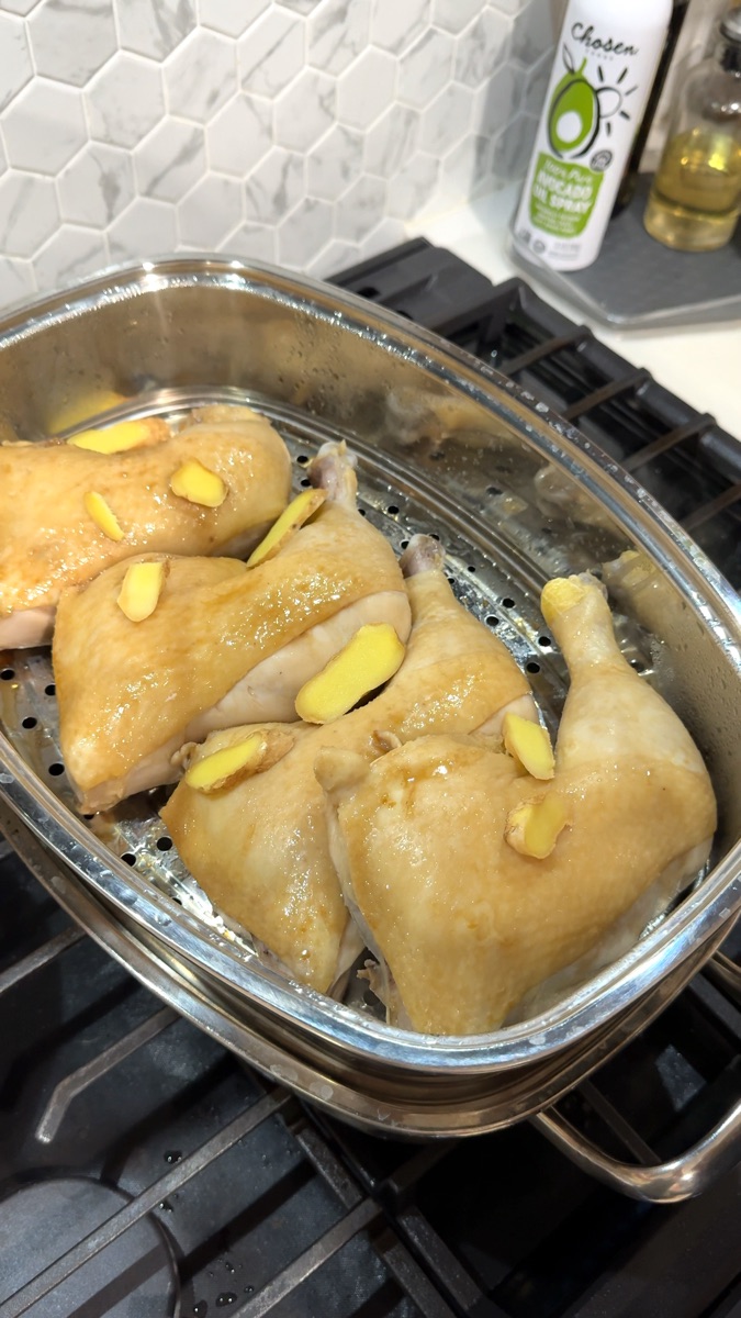 Place the marinated chicken into the hot steamer. Layer the sliced ginger directly on top of the chicken legs right away (don't do what I did in the video and add them late!). The ginger aroma infuses the meat from the start this way.