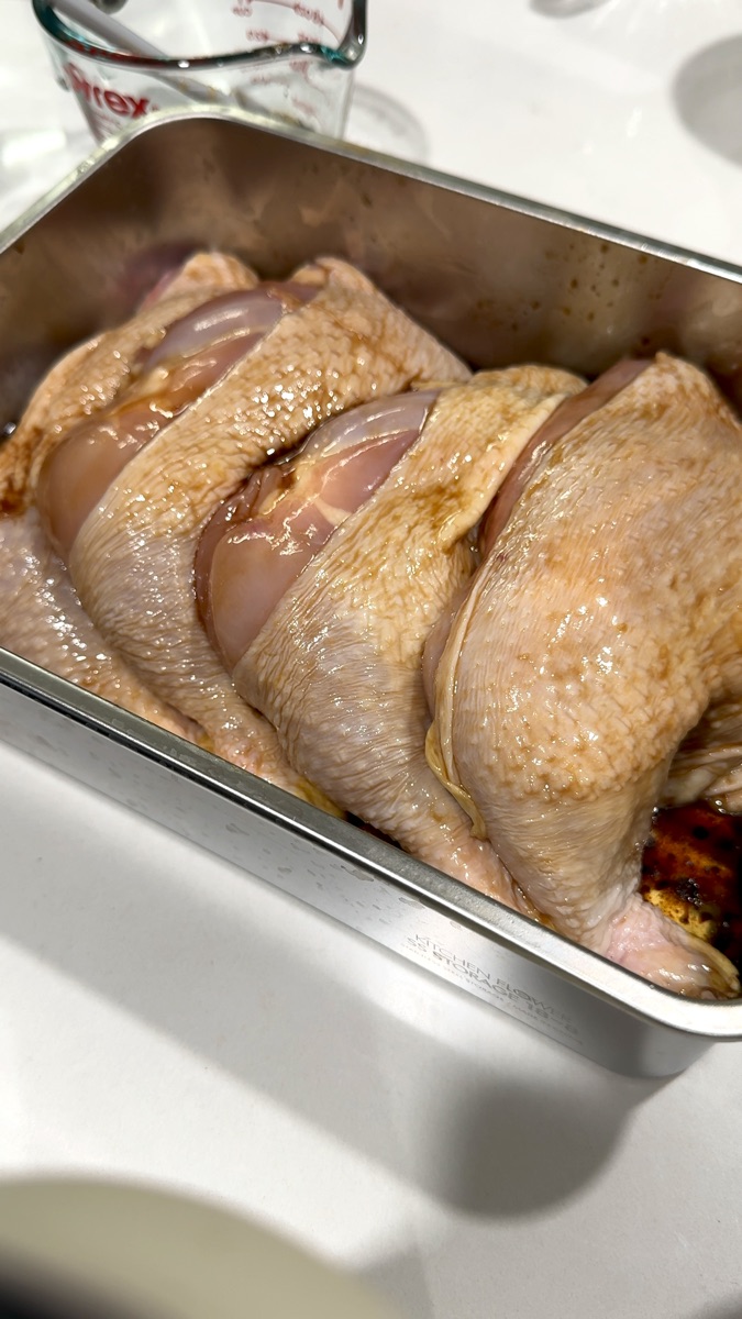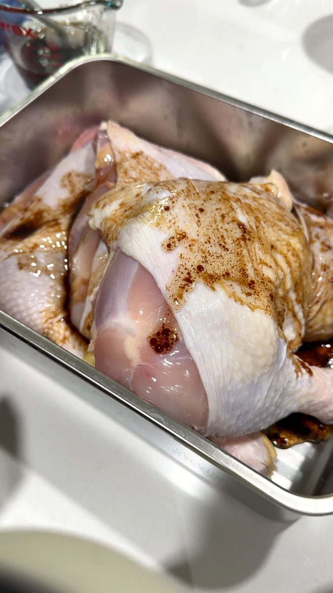 Score the chicken legs slightly if they're extra thick. Then massage the marinade (soy sauce, sesame oil, and rice syrup) all over the meat, getting into every crevice. The good news: you only need about 5 minutes of marination. A quick coat is genuinely enough for the flavor to stick!