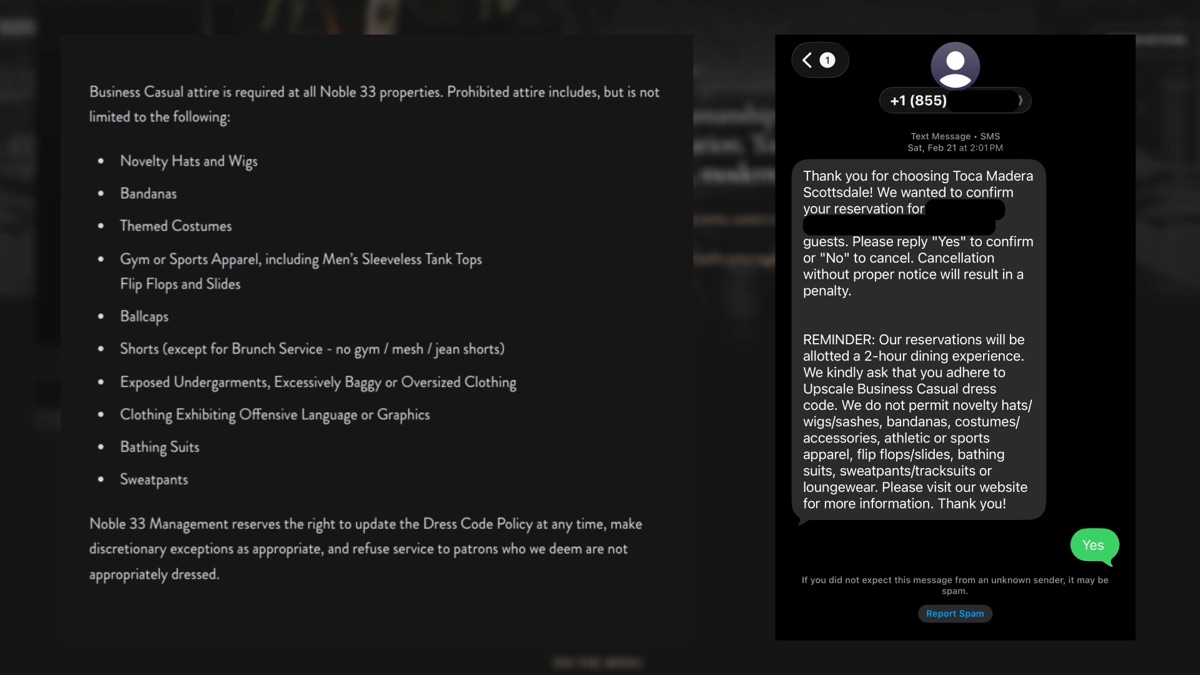- Dress code: Enforced. They will text you a reminder before your reservation. Plan accordingly.