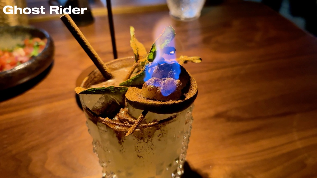 I do not usually like margaritas. They tend to be too sharp and sour for me. The Ghost Rider did not have that problem. It is smooth, not too tart, and the presentation is genuinely fun: they serve it with fire at the table. The price makes more sense once you see it arrive.