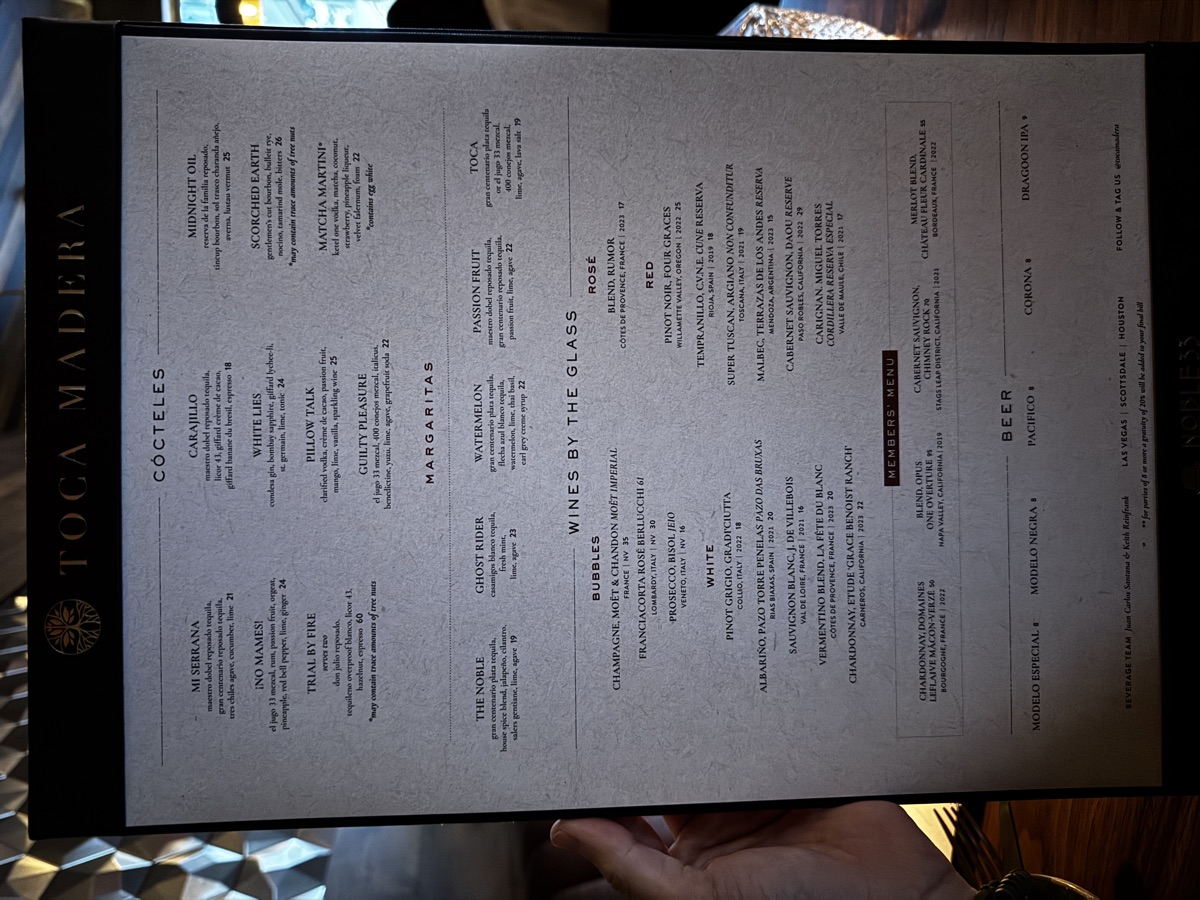 The dinner menu leans toward premium cuts and Mexican-inspired small plates. Appetizers average around $30, cocktails around $20 each. We spotted a members menu at the table, which turned out to be available to anyone. Members just get discounted pricing. A full membership runs $2,000 a year, so we passed on that and ordered from the regular menu.